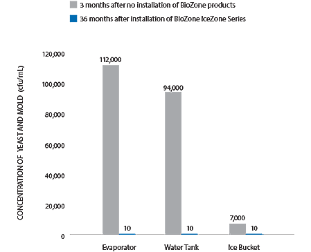 美國(guó)一家大型連鎖會(huì)員制俱樂(lè)部高度關(guān)注制冰機(jī)中的細(xì)菌含量。然后在兩臺(tái)經(jīng)過(guò)專業(yè)清洗的制冰機(jī)上進(jìn)行測(cè)試:一臺(tái)裝有百屋純?設(shè)備,另一臺(tái)沒(méi)有。結(jié)果的差異是驚人的,安裝了百屋純?的機(jī)器所有部分的細(xì)菌濃度在很長(zhǎng)一段時(shí)間內(nèi)保持在比另一臺(tái)機(jī)器低得多的水平。。