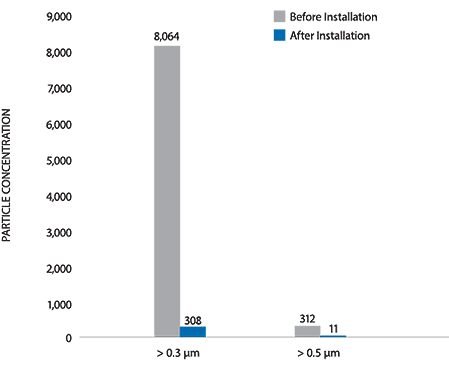 百屋純?設(shè)備已安裝在芬蘭赫爾辛基一家致力于過敏和哮喘的組織的新鮮空氣系統(tǒng)中。 測(cè)試結(jié)果表明,安裝BioZone?設(shè)備后,>0.3μm的顆粒物原始濃度降低了96.2%,而>0.5μm的顆粒物濃度降低了96.5%。該測(cè)試報(bào)告由VTT Technical Research Centre of Finland所提供