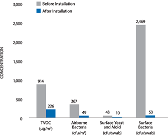 尖沙咀一個大型購物中心,非常注重電梯間的空氣質(zhì)量,特別是關(guān)注細菌和難聞的氣味這兩方面,因為這里有大量的流動人口。為了提升空氣質(zhì)量,特意安裝了百屋純?EZ-10設(shè)備。安裝后,電梯間的空氣質(zhì)量有了很大的提升,大大降低了電梯間里面難聞的氣味和存在的細菌,其中物表的細菌和霉菌分別下降了97.9%和76.7%以上。