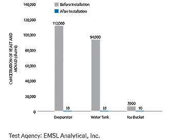美國(guó)一家大型會(huì)員俱樂(lè)部的連鎖店高度關(guān)注制冰機(jī)中的細(xì)菌含量。他們特意挑選兩臺(tái)專業(yè)的制冰機(jī)進(jìn)行測(cè)試,其中一臺(tái)安裝百屋純?IZ-X純冰系空氣凈化裝置,另外一臺(tái)沒(méi)有裝。在測(cè)試結(jié)果對(duì)比中,差異驚人,裝有百屋純?IZ-X純冰系列制冰機(jī)的含菌量及耗電量比沒(méi)有裝的低得多,處于一個(gè)極低的水平。